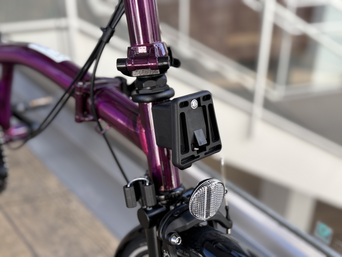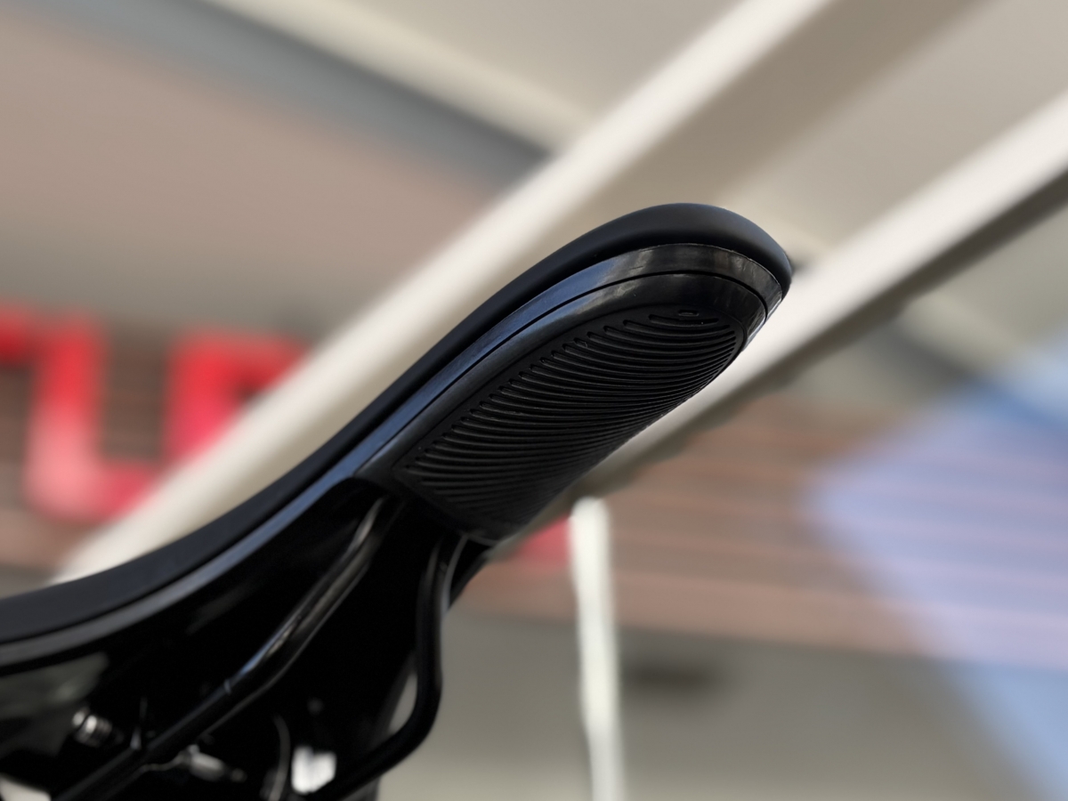 前方にグリップが付いており、畳んで持ち運ぶ際にこれがまぁ楽チンなんです。この構造は多少違いはありますがC-LINEの純正サドルにも採用されてます。