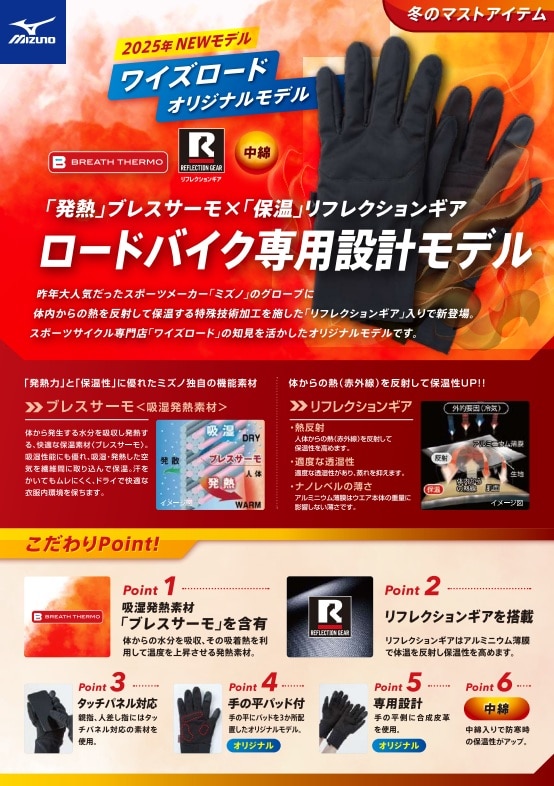今回は、ワイズロード冬の定番として毎年人気のY’s Roadオリジナルモデル MIZUNO ブレスサーモ中綿グローブをご紹介します。