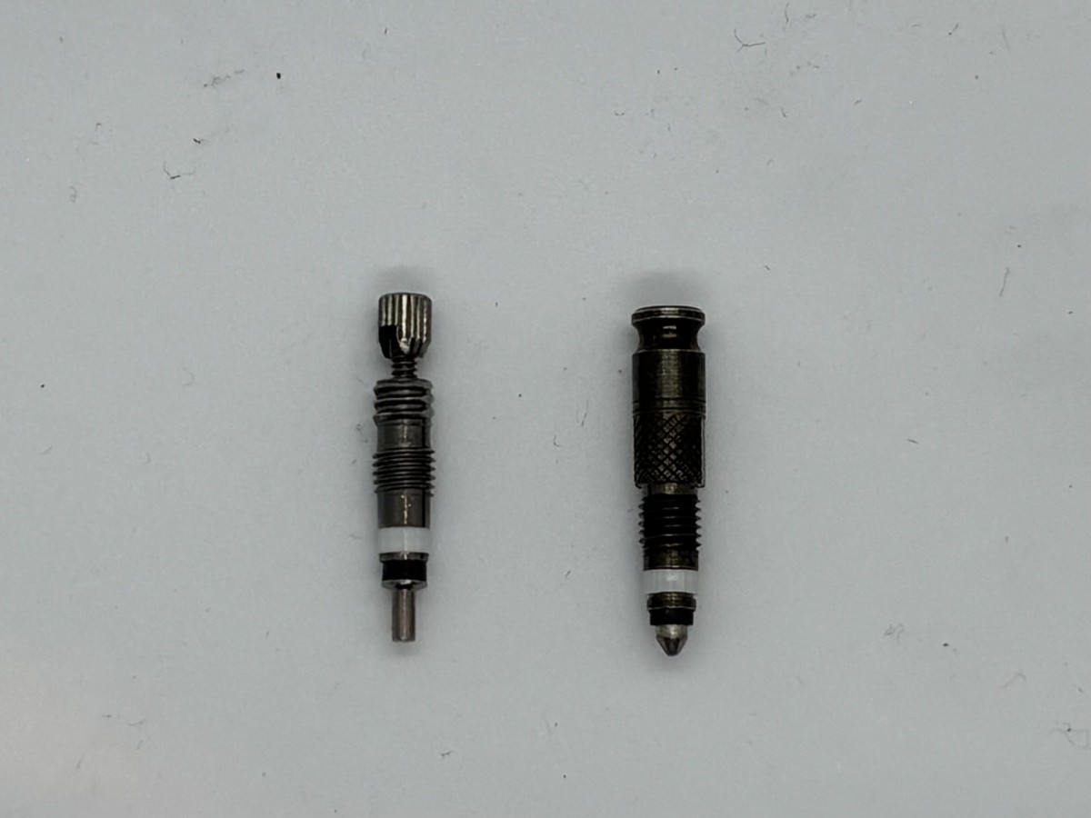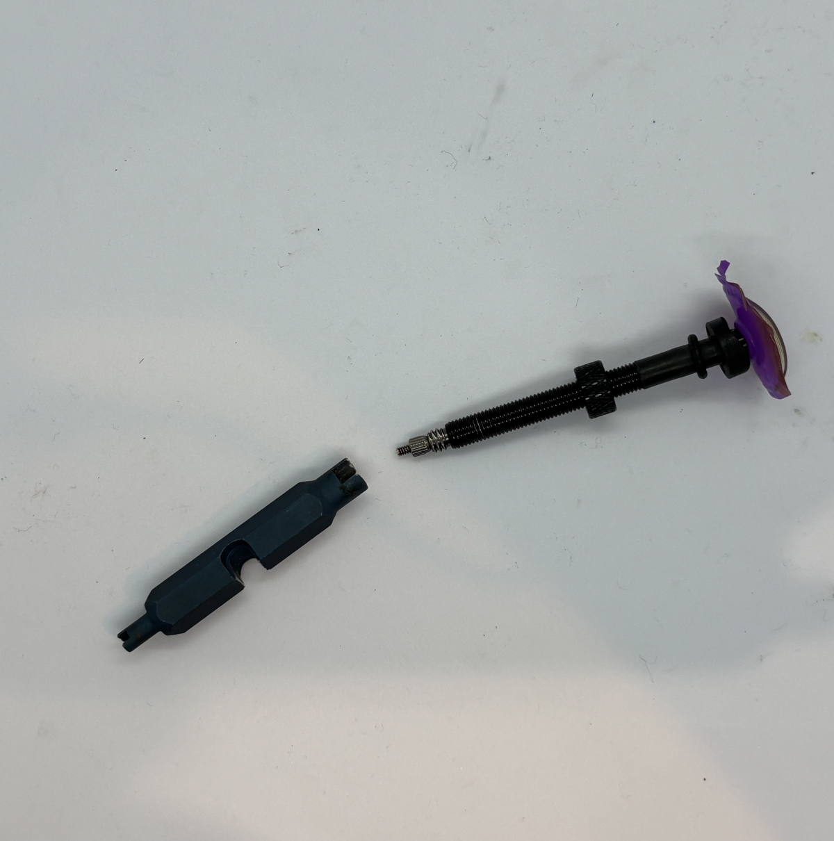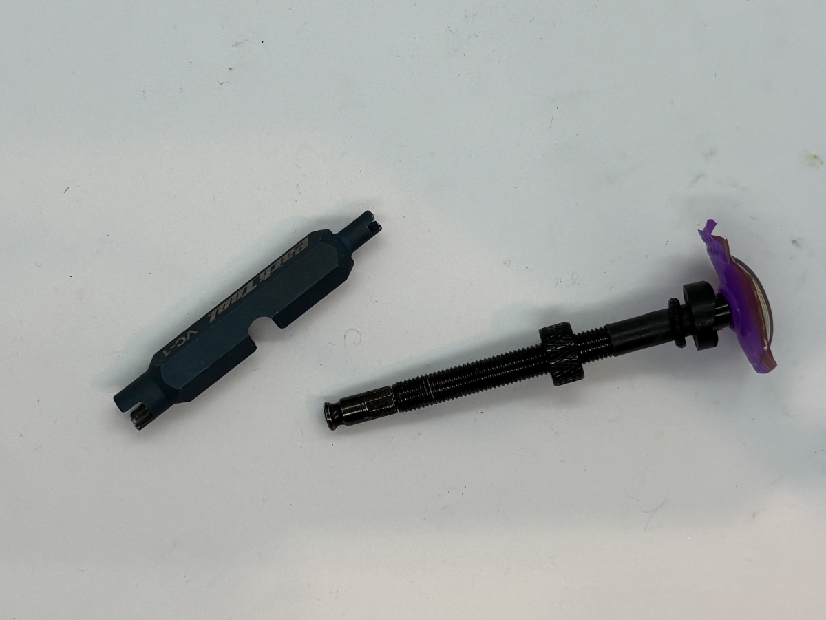 写真のバルブコアツールは自前ですが、コの字型のバルブコアツールが付属しているのでそれでコアを取り外します。