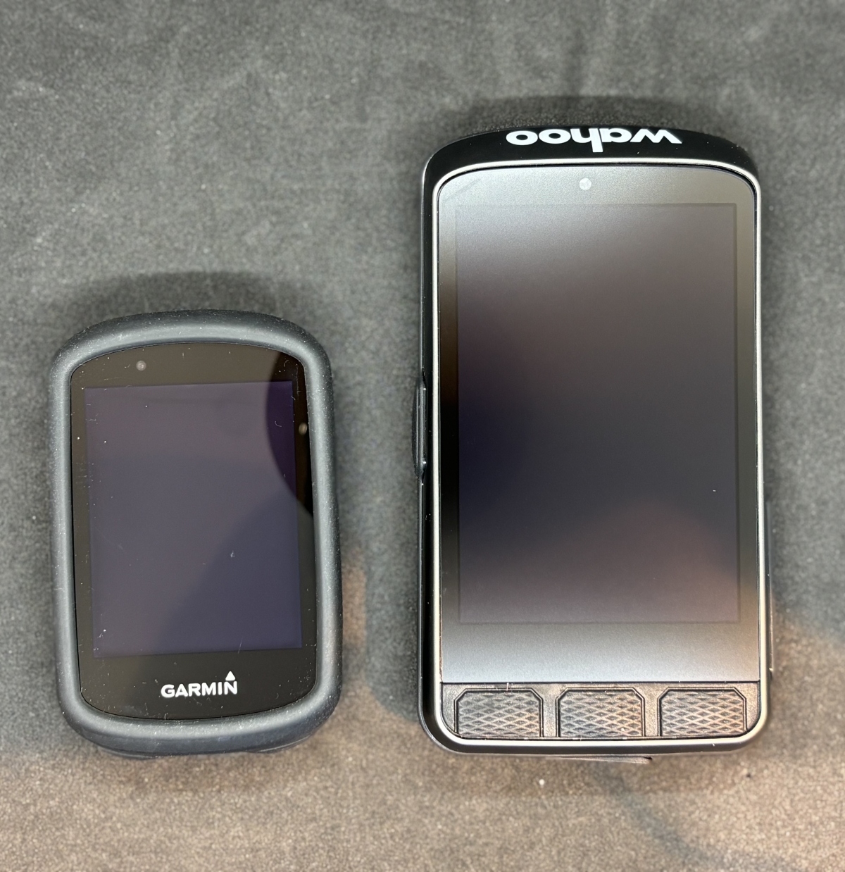 一目瞭然のサイズ差ですよね、GARMINの方がディスプレイサイズ2.6インチに対してWAHOOの方は3.8インチと1.5倍くらい大きくなっています。
