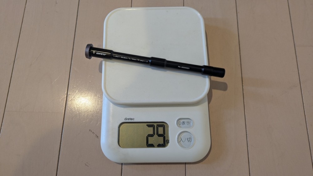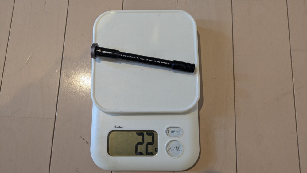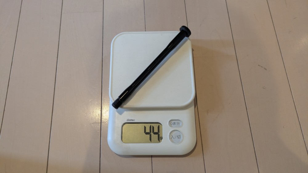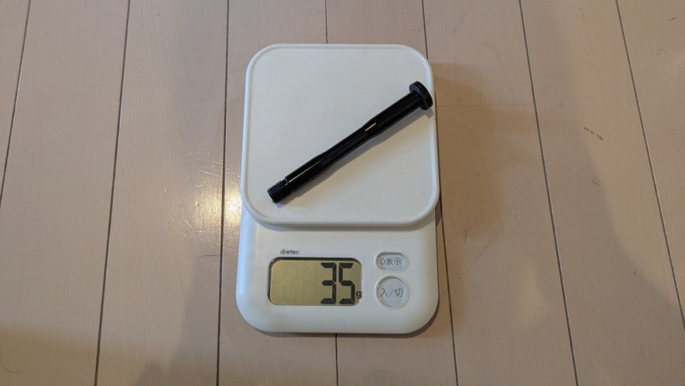 まずは元々完成車に付属していたスルーアクスルです。前後合計で79gでした。見た目的にもthe普通のスルーアクスルといった感じです。