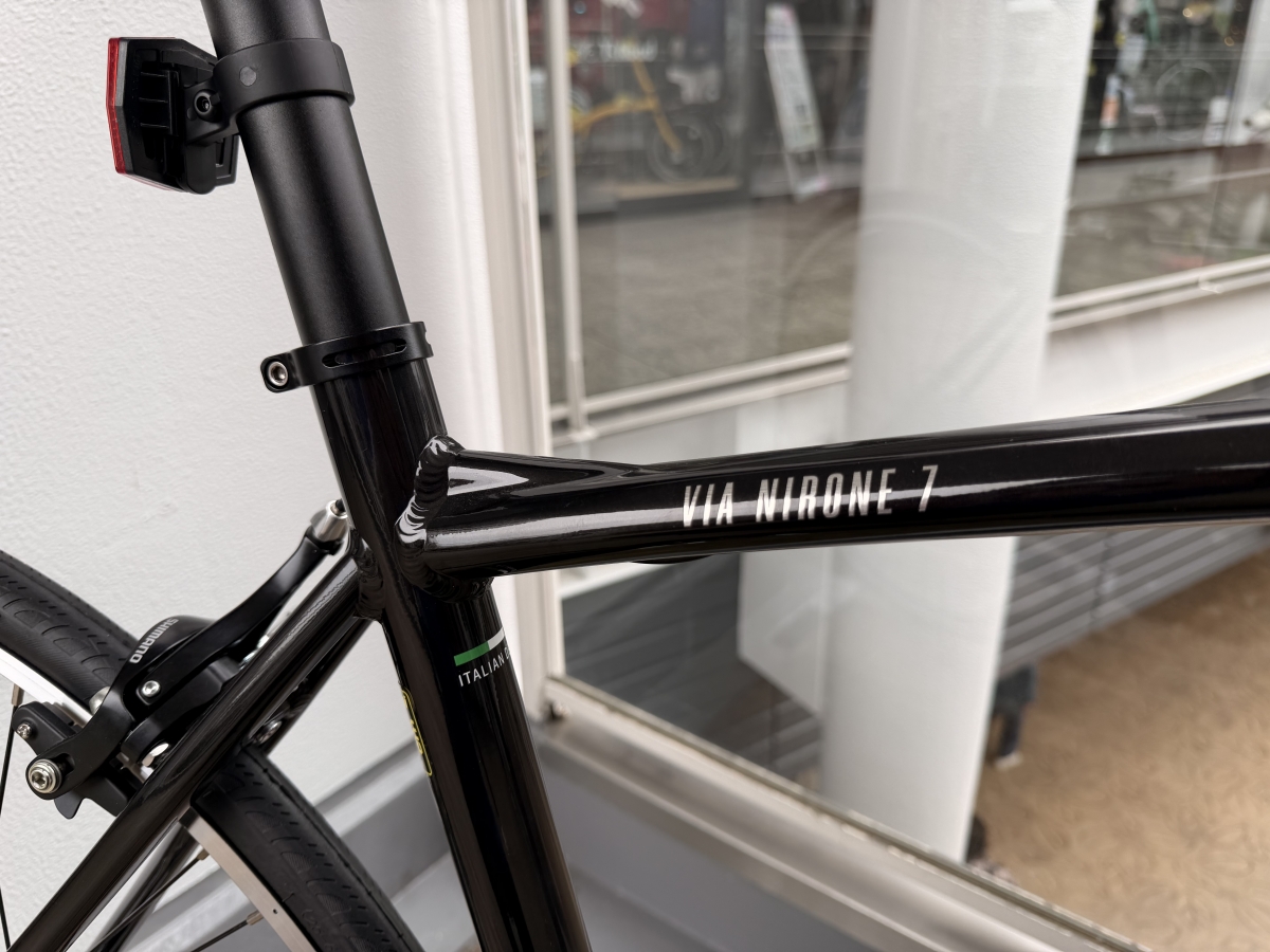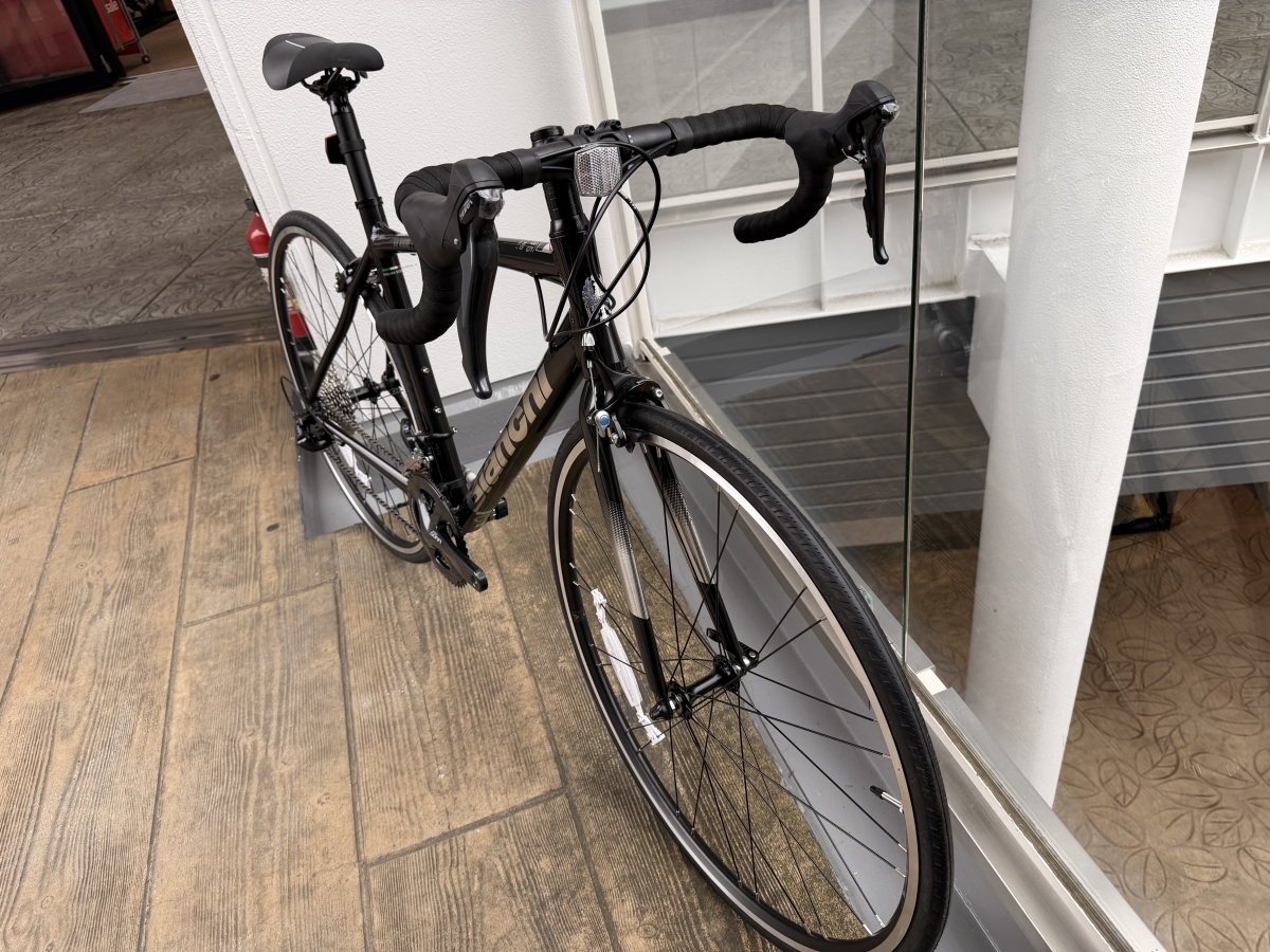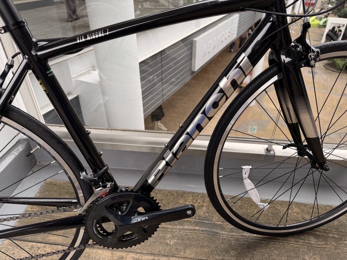 ブラックのフレームにシルバーのBIANCHIのロゴが入っていてかっこいいですね!