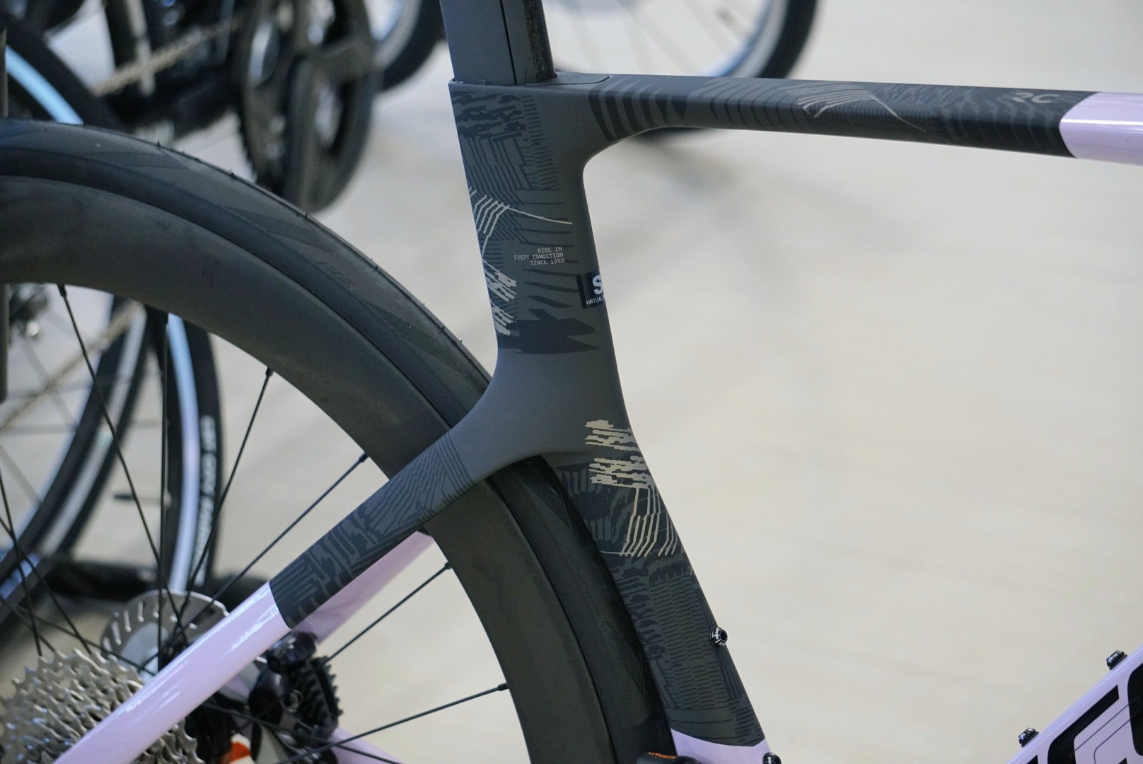 艶ありのバイオレットピンクと艶消しブラックのツートンでも十分カッコよさそうなものですが、カーボンブラック部分にはダズル迷彩のような不規則なデザインが施されています。細かな文字もデザインの一部として組み込まれており、配置や向きにこだわりを感じます。