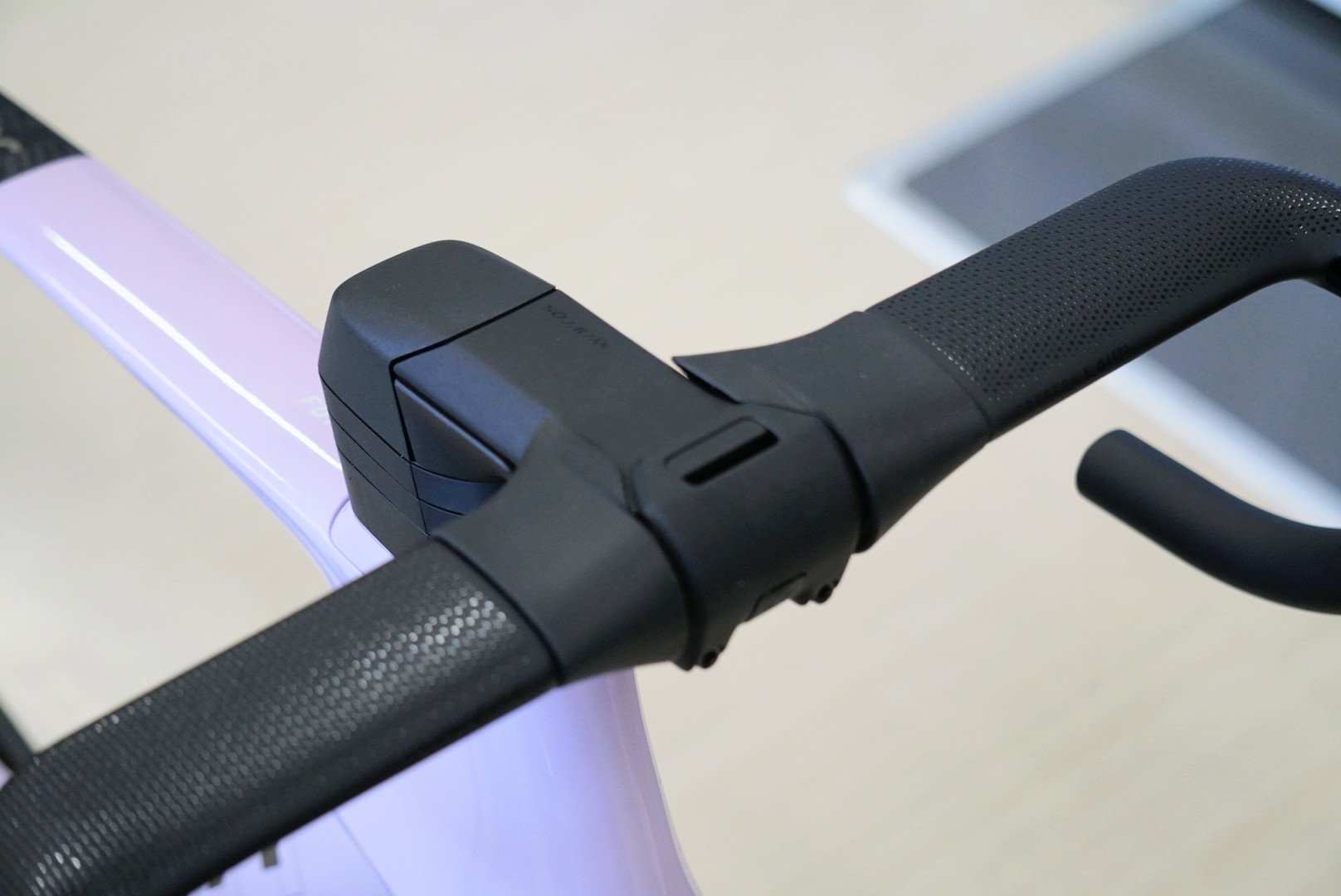 ハンドル・ステムは別体であるもののハンドルクランプ部分にはラバースリーブ、ステムにはカバーを設け一体型ハンドルと同等の空力性能を実現。