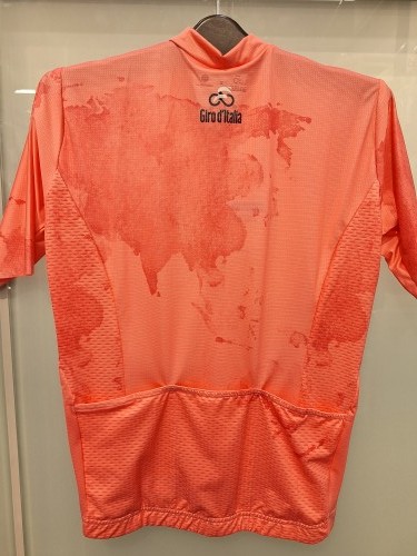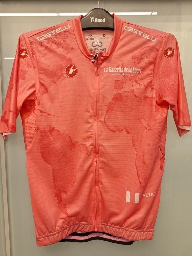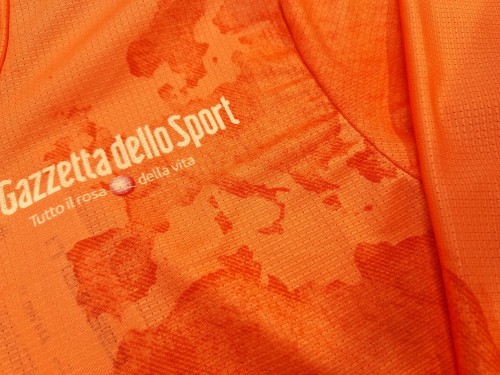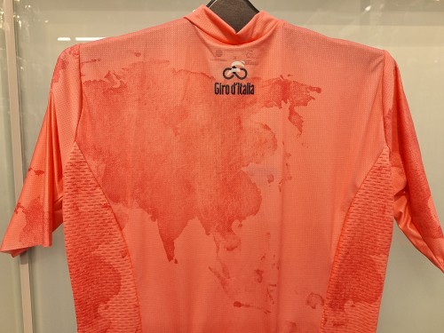 ジロ・デ・イタリア公式ジャージのデザインは、2024年にイタリア外務・国際協力省から「スポーツ外交の大使」として公式に認定され、その栄誉を記念し、マリア・ローザ(および他の3つのリーダージャージ)は、ジロの世界的な発展を反映するようにデザインされています。よく見てみると世界地図のようですね。繊細なプリントが印象的です。