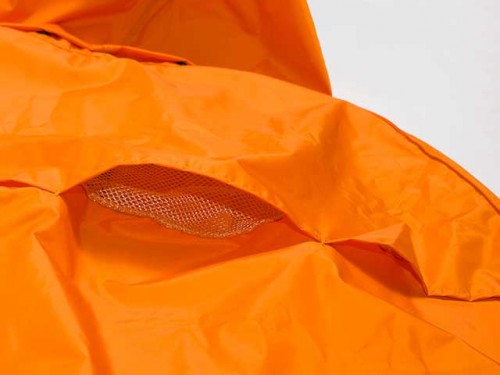 更に、背中にベンチレーションスリットを設け、首元のファスナーを空けることでより多くの空気を取り込み、背中やポンチョの下へと空気の流れを作ることが可能です。