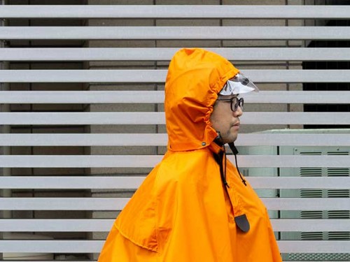 着脱式のフード付きで、視界をある程度確保しつつ雨を遮る透明のバイザー付き。