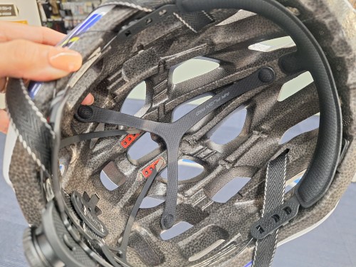 頭部からヘルメットを浮かせてエアルートを確保するフローティング構造と、Y字形状により接触面積を減らし通気性を高めます。
