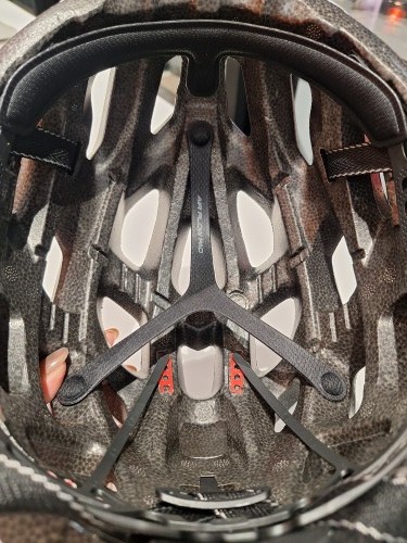 頭部からヘルメットを浮かせてエアルートを確保するフローティング構造と、Y字形状により接触面積を減らし通気性を高めます。