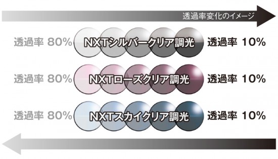 川崎ウェア館に入荷したカラーはクリスタルクリアフレーム:NXTシルバークリア調光(80%~10%)とブラッククリアフレーム:NXTスカイクリア調光(80%~10%)です。