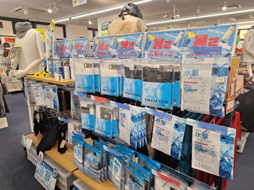 汗と風でひんやりが続く、続く暑い日に欠かせない様々な種類のFREEZE TECH製品をまだまだ店頭にご用意致しております。