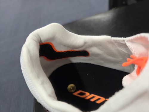 アッパー甲と踵の部分には、お馴染みのオレンジのDMTロゴが挿し色で入るシンプルなデザイン。