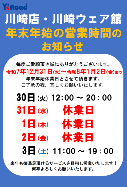 暮れも押し迫ってまいりましたが、年末年始のワイズロード川崎店/川崎ウェア館の営業時間のお知らせをいたします。