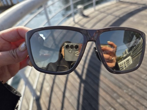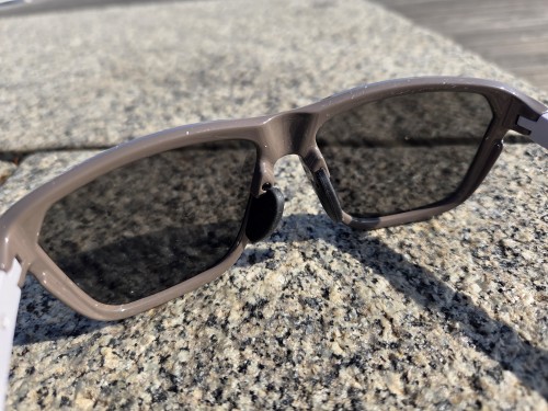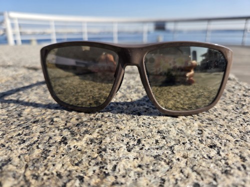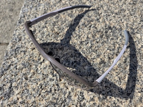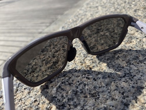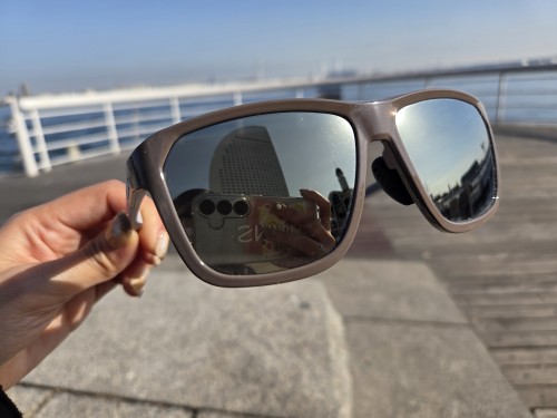 見た目のデザインもベーシックなフルフレームで、カジュアルなスタイルに合わせやすく非常に好印象でした。カジュアルなモデルなのでレンズはスポーツタイプのモデルとは違いフラットですが、レンズが3D球面レンズなので、目線を動かしてもレンズに目が覆われているような感覚で視野が広い印象でした。