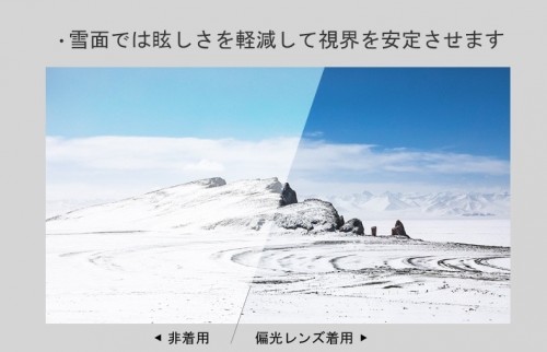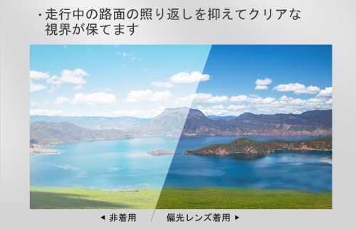 レンズは偏光レンズになっています。偏光レンズは、レンズ内に特殊な偏光フィルムを挟むことで、路面や水面からの強い「乱反射(ぎらつき)」だけを効果的にカットし、視界をクリアにするレンズです。通常のサングラスが光の量を全体的に減らすのに対し、偏光レンズは必要な光は通し、不要な反射光だけを選択的に遮断するため、反射が強い環境でも視認性を高め、目の負担を軽減します。
