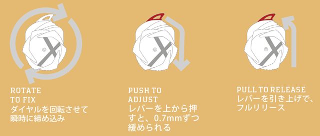 一つのレバー操作でフル・リリースと少しずつ緩めていく微調整が可能です。どのグレードでもダイヤルが付いているモデルは微調整が簡単に行うことが出来ます。BOAダイヤルとは違いますが、エントリーグレードから微調節できるダイヤルは、慣れてしまえば使い勝手がいいです。