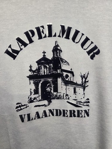 胸元にはKAPELMUURの名前の由来にもなっているベルギーのカペルミュールの丘をモチーフにしたデザイン。立体感のあるベルベットのような肌触りのフロッキープリントで仕上げています。