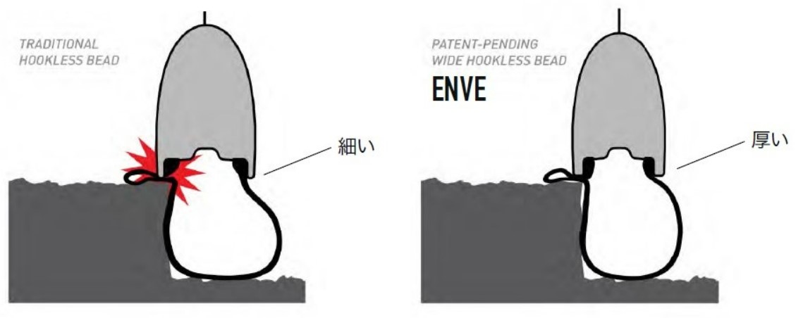 通常のホイールではタイヤをひっかけるためのフックがありますが、近年のレーシングホイールではフックレスが主流に。これはレース界ではチューブレス運用がメインとなったためです。これによりクリンチャータイヤのためのフックが不要になった→軽量化につながったという背景があります。(※余談ですがIRC ASPITE PROはクリンチャーでありながらフックレスリム対応です)