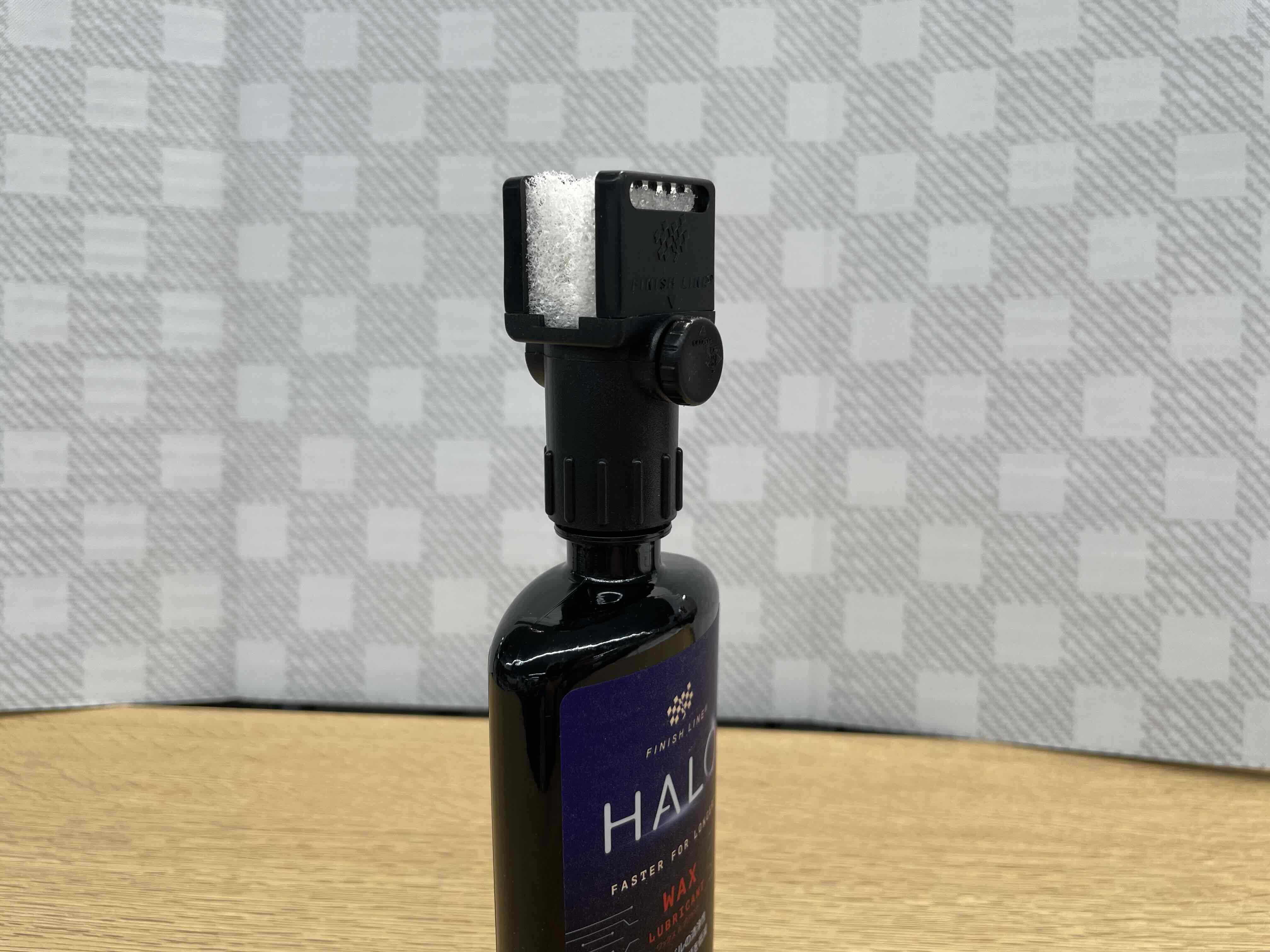 いつものフィニッシュラインのオイルには見慣れないものが上に装着されていますがスポンジにしみこませたオイルでチェーンへ均等にオイルを塗布するためのものでそれを取るといつものフィニッシュラインのケースです。