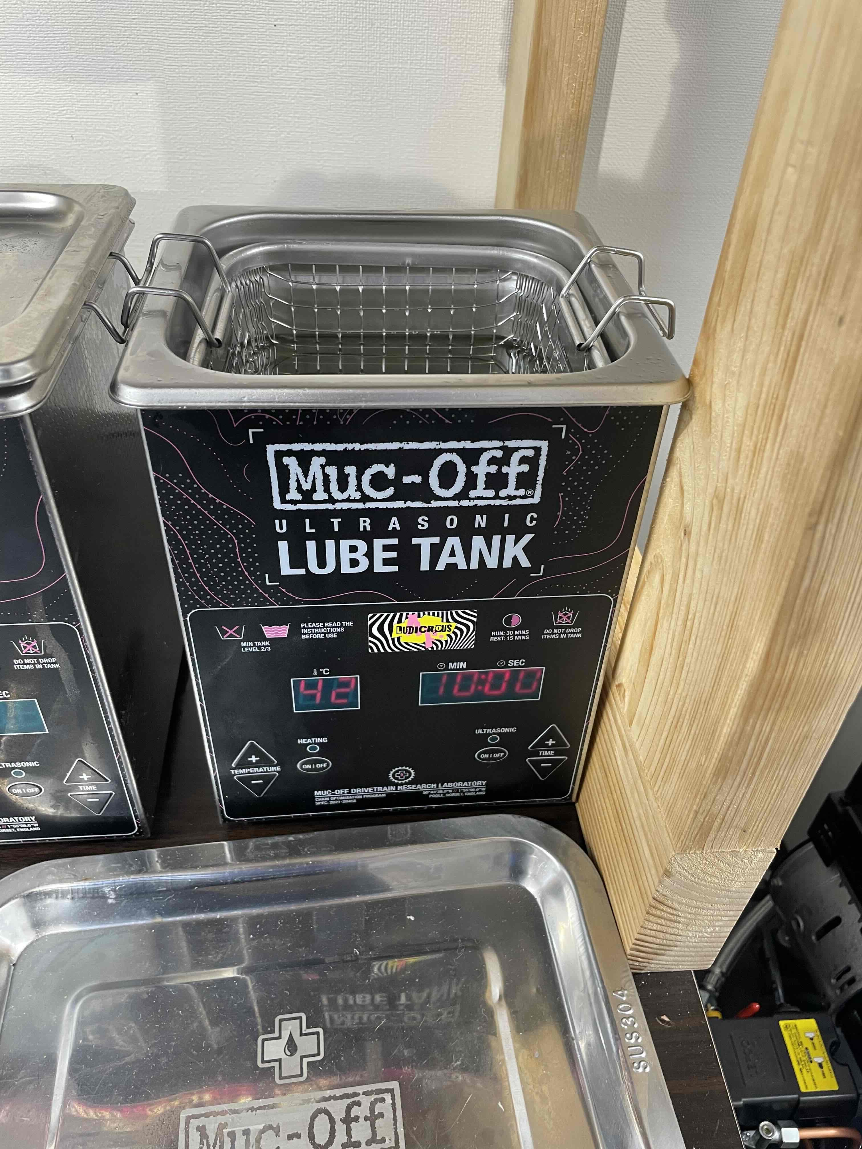 マックオフの最高級チェーンオイル「LUDICROUS AF LUBE」を超音波にてチェーンの隅々まで行き渡らせます。