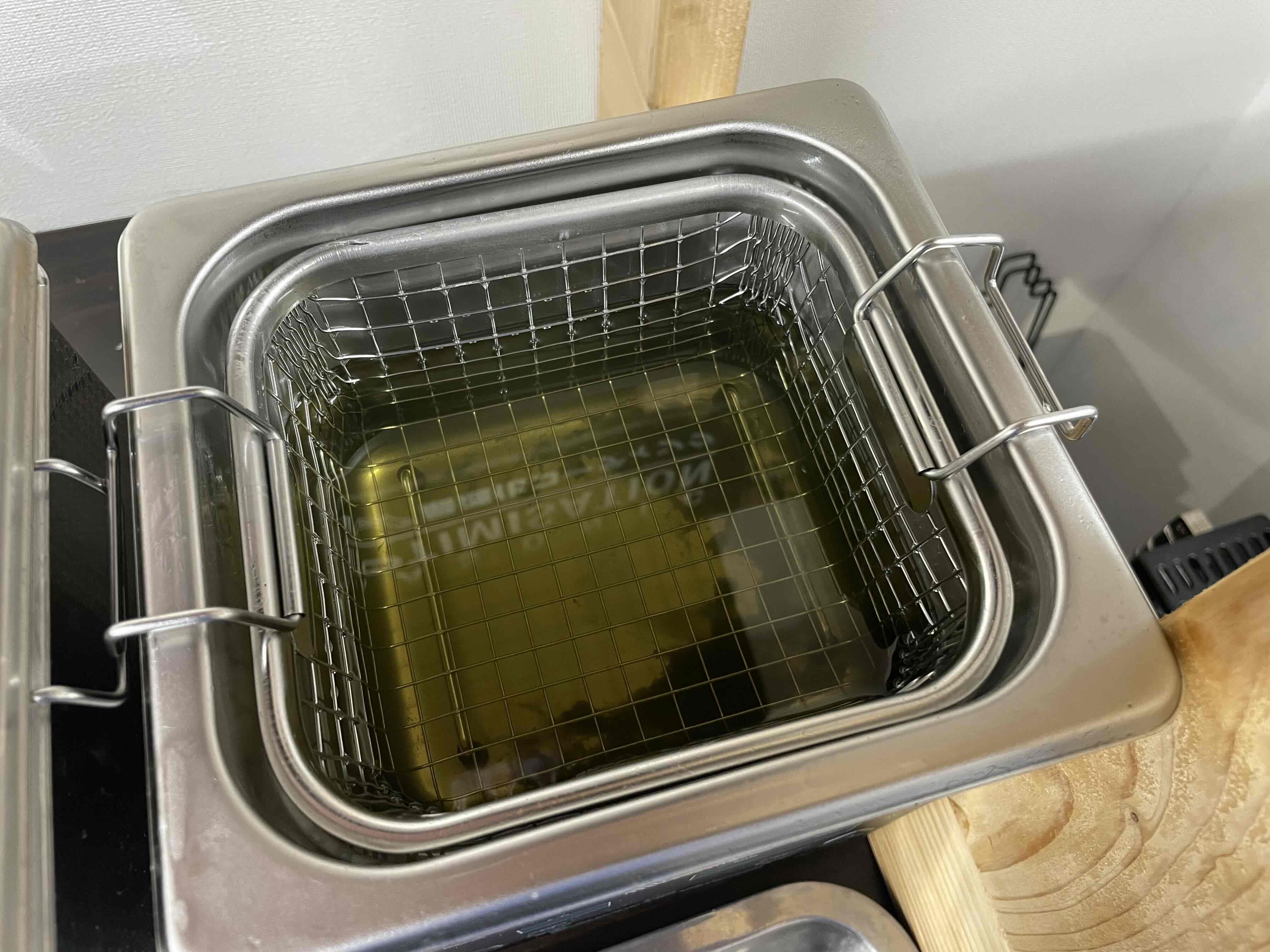 まず最初にディグリーザー入りの超音波器でチェーンに付いたオイルや汚れを完全に脱脂洗浄します。