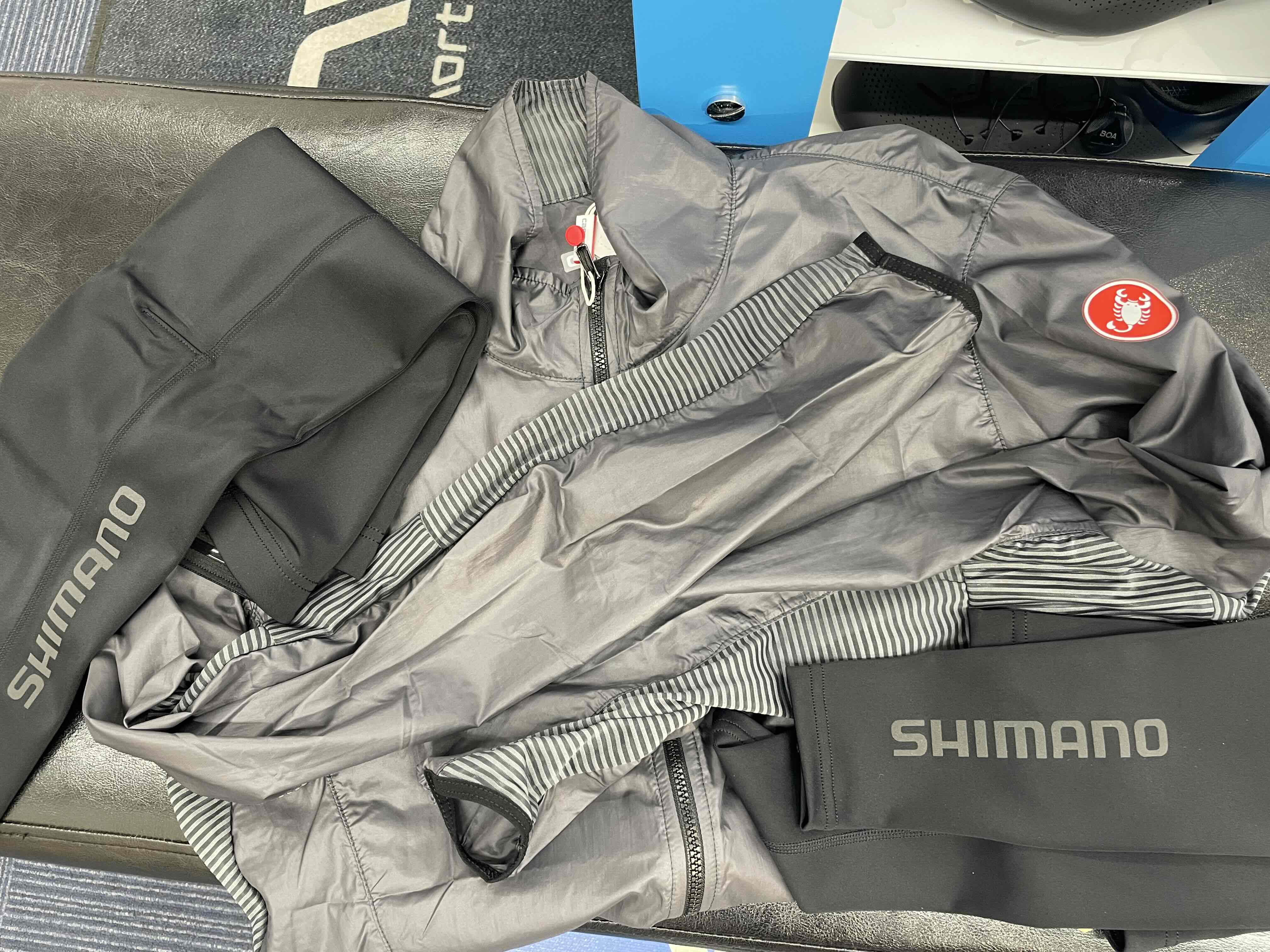 レッグウォーマーとアームウォーマーとウィンドブレーカーは必須になります。