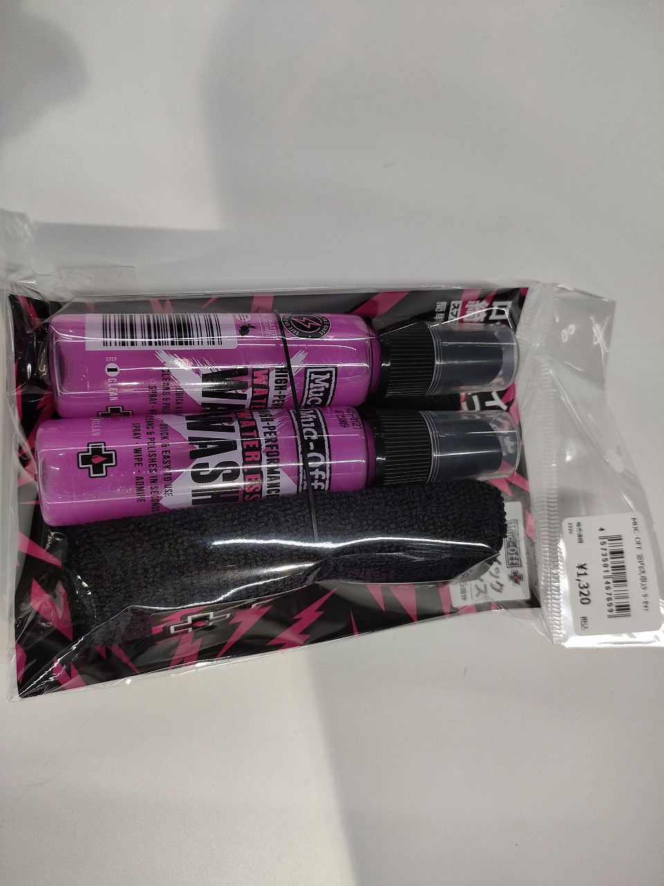 マイクロファイバータオル、Muc-Offステッカーが入っています。