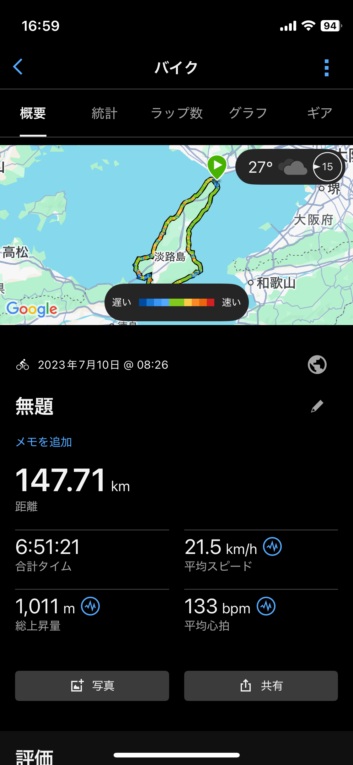 こちらは自転車用ガーミンのエッジシリーズにて記録したデーターで去年まで勤務していたワイズロード大阪本館のスタッフ数人と行った淡路島1周のときのものです。