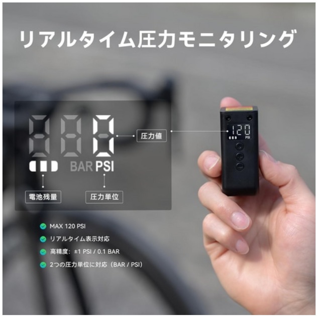 電動ポンプはパンク修理時に短時間且つ失敗することのない安心感を得られることに加えて、空気圧設定のできるモデルでは1psi単位で空気圧を調整可能なので、自分の好みの空気圧をライド中に調整することができるのもメリットかと思います。
