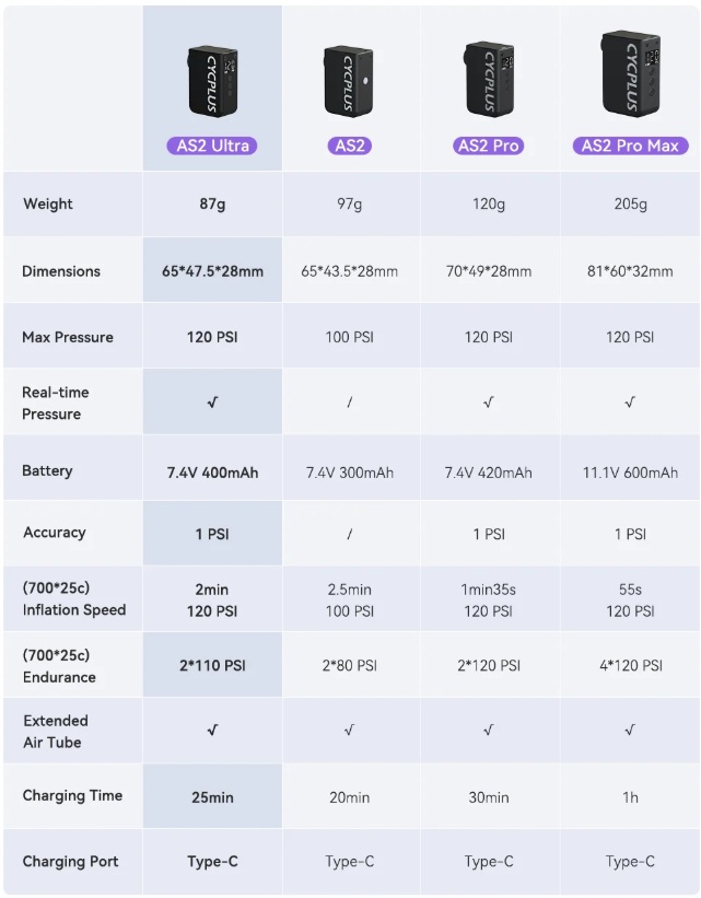 これまでAS2シリーズは「AS2」「AS2 Pro」「AS2 Pro Max 」の3モデル展開で、最も小型の「AS2」は97gと軽量、小型ではあるものの液晶画面の付いていないモデルで空気圧の設定が出来ません。他の上位モデルは設定した空気圧まで空気が充填されると自動で止まります。