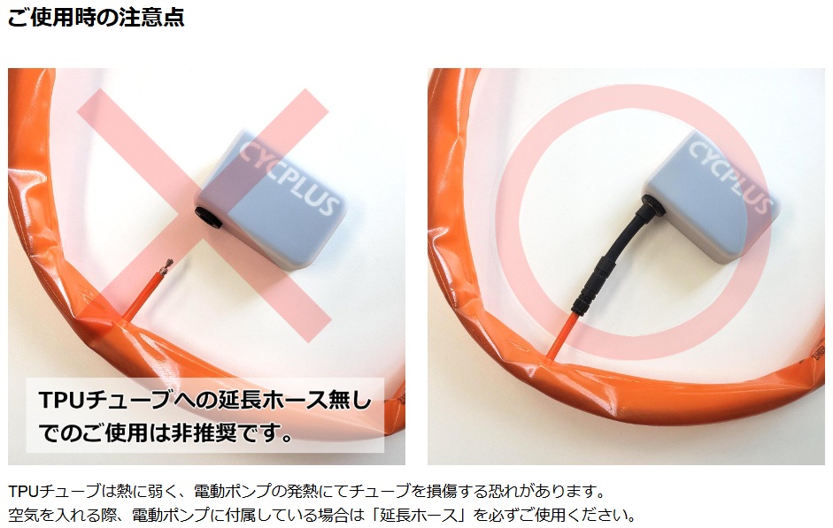 付属品は既存モデルと同様の内容物が入っています。使用時は電動ポンプ自体が発熱でかなり熱くなるため、TPUチューブに使用する場合には延長ホースを使用してください。