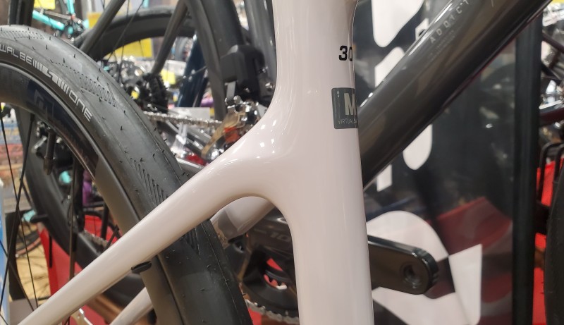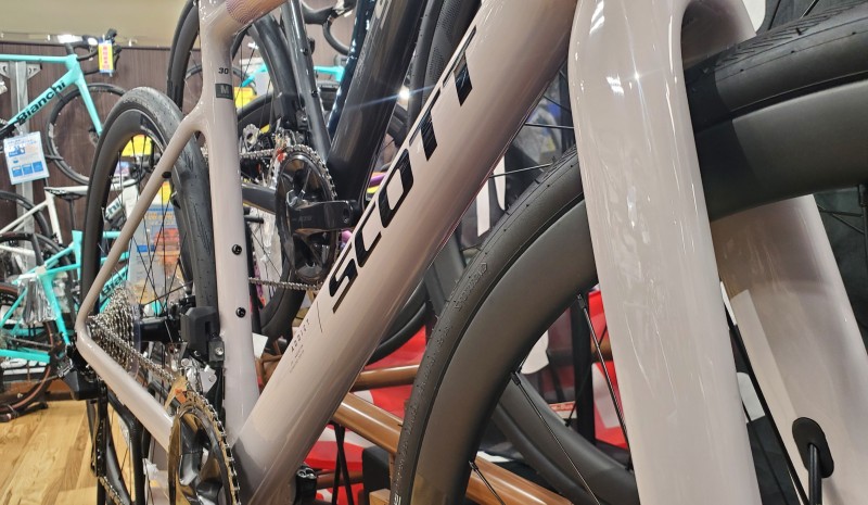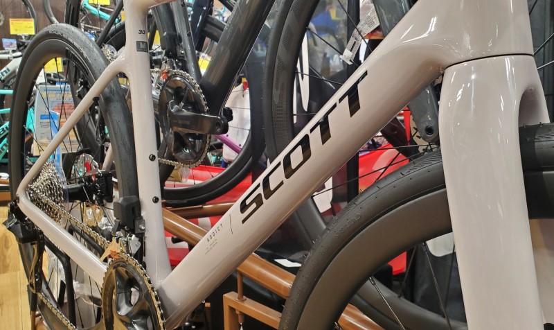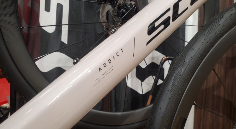 SCOTTが用いるカーボンにはHMX SL、HMX、HMF、の三種類があり、今回ご紹介するADDICTはHMFカーボンを使用しています!HMXやHMX SLを使っている軽量なADDICT RCや高剛性なFOIL RCと比較するとペダリング時の脚辺りはダイレクト感はありつつも適度にマイルド、振動吸収性能も高くHMFはロングライド向きなマテリアルです!