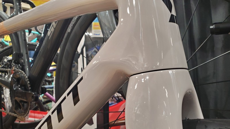 かつてのFOIL(リムブレーキ全盛時代ぐらいの)を彷彿とさせるダウンチューブの形状、横風の影響を受けにくく、それでいて正面からの空気抵抗を削減する効率的な形状!そしてヘッドチューブとの付け根のあたりのエアロ要素を取り入れた形状もとても美しく、個人的に好きなポイント、一般的な「エンデュランスモデル」とはかけ離れたエアロ形状を纏っています!ルックスはADDICT RCとそっくりなので車体の高速巡行性能は折り紙付きでしょう!
