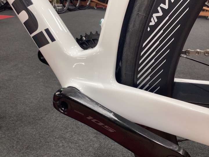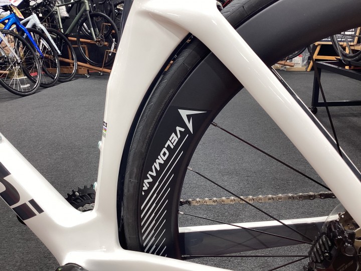 シートチューブとタイヤの距離が非常に近く、極限まで空力を煮詰めた設計になっています。