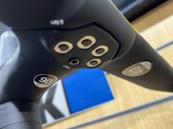 コックピット周りは、専用のエアロハンドルとステムが付属しています。多くのメーカーがハイエンドモデルに採用するステム一体式ハンドルではなく別体式を採用していますが、ボルトは空力の影響を最小限にするため下側でジョイントする形になっており、ボルト分の重量増はあるものの、その分ポジション変更時にはステムだけ交換すれば良いのは別体式のメリットです!(とは言え、ステム単体の価格は税込で88,000円です!)