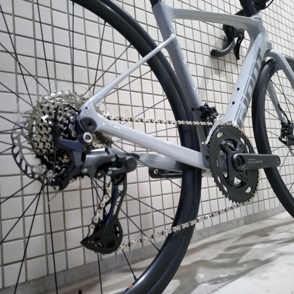 2x10速で、かつ、フロントには50x34T、リアスプロケットは11x39Tとかなりワイドになっており、初心者に優しく様々な路面で最適なギアチョイスができるようになっています。