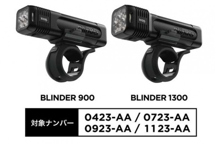 8/25付、KNOGの国内輸入代理店であるダイアテック株式会社より自転車用フロントライト「BLINDER 900」、「BLINDER 1300」に関して、一部生産ロットの自主回収、交換の発表がありました。理由は加熱発火の事例が報告されているとのことです。下記対象ロットの製品をお持ちのお客様は直ちにご使用を中止いただき、回収へのご協力をお願い申し上げます。
