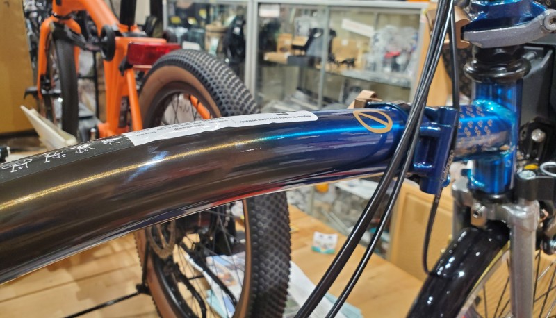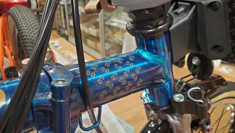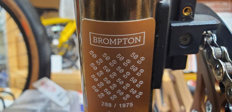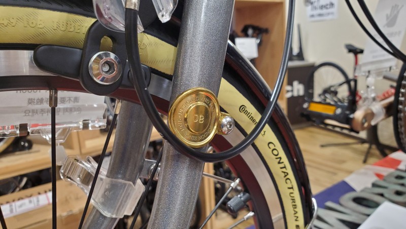 BROMPTONの工場にいる52名の職人のイニシャルが刻印された真鍮製のコインがフロントフォーク左側面に施されています!ワイズロード川崎店に入荷した車体は「DB」さんによって作られたフレームです!