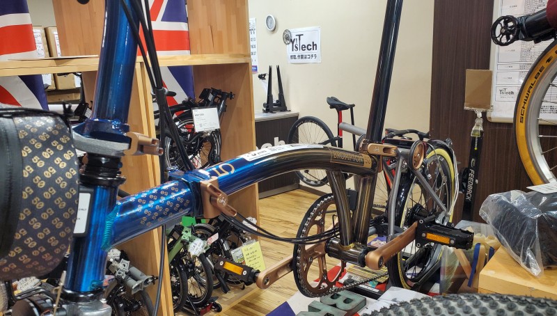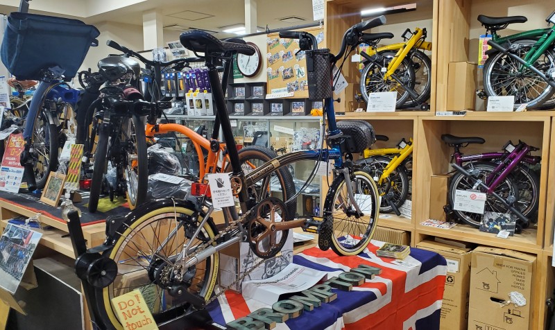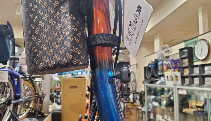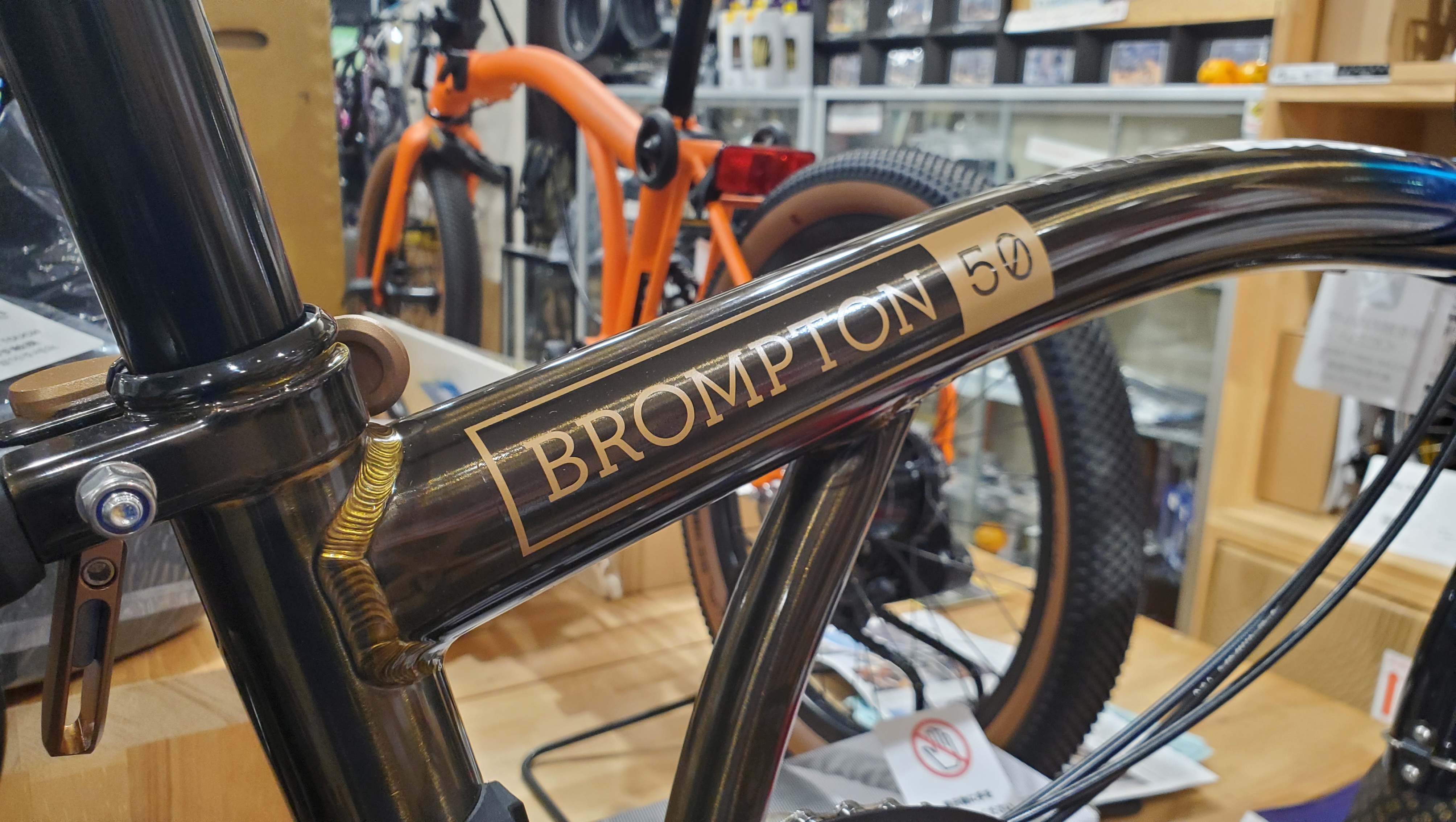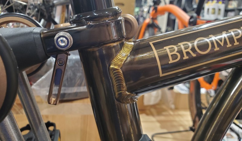 フレームはBROMPTONの職人技が垣間見えるラッカー仕上げ、溶接痕が見えるこのカラーリングは初代ラッカー仕上げのRAWカラーから現在のブラックラッカー筆頭に人気のカラーです!
