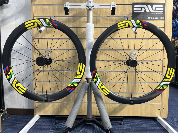 この記念モデルは、ENVEのロゴがツール総合優勝者の象徴であるマイヨジョーヌのイエローと世界戦を制した証である五大陸を表す緑、黄、黒、赤、青の5色のアルカンシェル(虹)カラーのラインに塗り分けられたデカールとなっており、実際に今年のツール・ド・フランス最終日はポガチャル選手自身が使用していました。