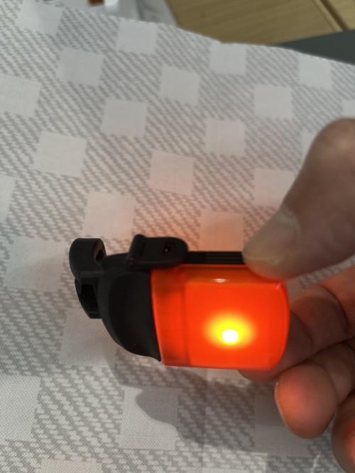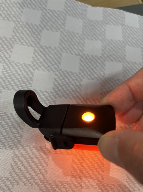 下写真のとおり、LEDライトは上下に付いており、上下同時点灯とパルス点滅、上のみ、下のみでパルス点滅できます。