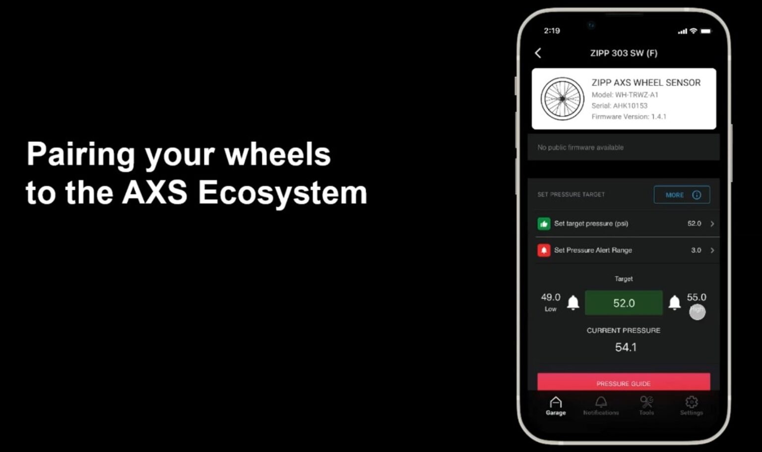 設定空気圧はスマートフォンの専用アプリSRAM AXSで使用タイヤやライダーの体重、走行する路面の状況などの情報を入力すると最適な空気圧が導かれます。