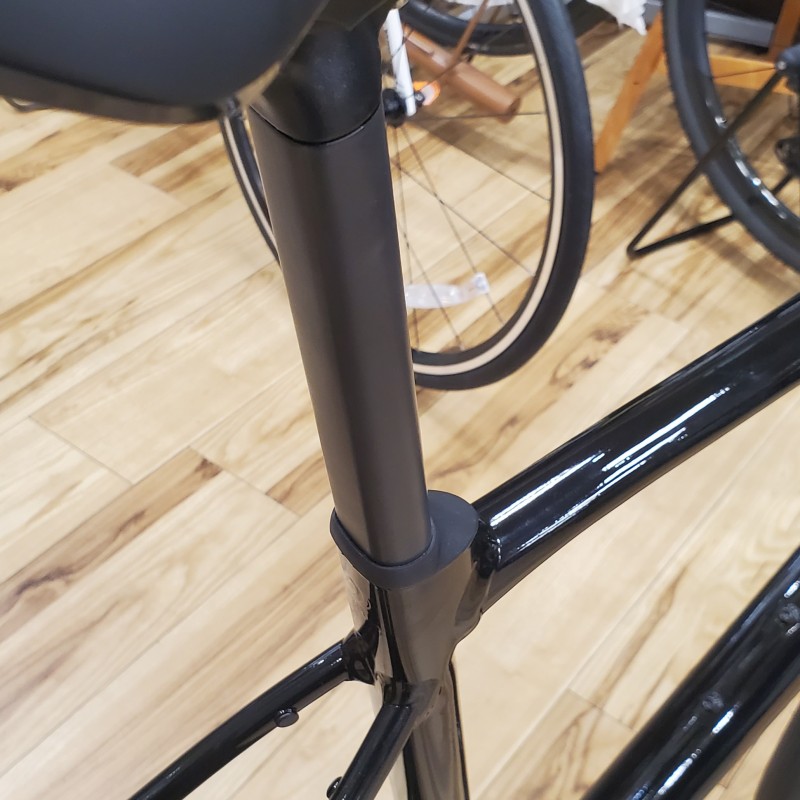 真円のシートポストではなく後端がフラットなD型シートポストを採用、乗車姿勢視点で後方向にしなりやすく乗り心地を向上しています!