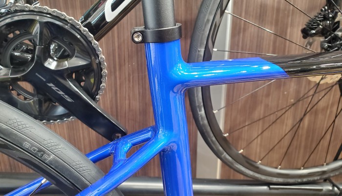 若干弓なりにアーチを描いたトップチューブはシートステイ同様に振動吸収を狙った形状、アーチ形状+シートステイ同様の横扁平で路面の突き上げを緩和、そしてヘッドチューブに向かうにしたがって太くなっていき、ヘッドチューブ周りの剛性は確保されており安心感のあるハンドリング性能を有しています!