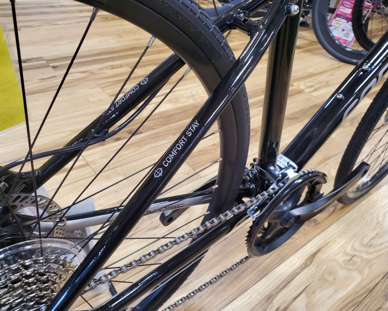 パーツ構成は軽快なクロスバイク、フレームで乗り心地を良くしている
