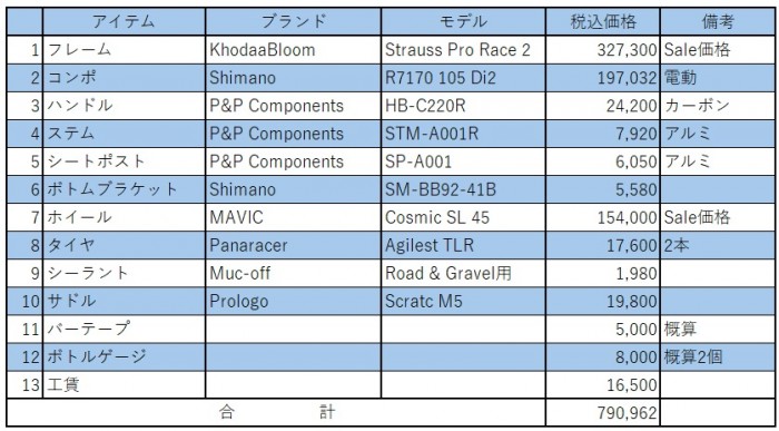 ホイールはMAVICのカーボンホイール、COSMIC SLの45mmハイトの旧モデル(前後重量1,575g)で、今なら15.4万円とセール中です!タイヤやサドルなど残りのアイテムに工賃を含めても80万円となりました!