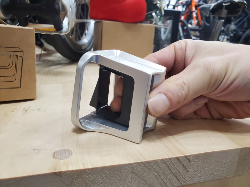 中心の黒い箇所を引くことで取り付けたバッグをリリースすることができます!樹脂のフロントキャリアブロックの場合はてこの原理でレバーを引きやすくしているのに対して、今回の新商品はレバーを指二本で引きやすくする構造にしています!