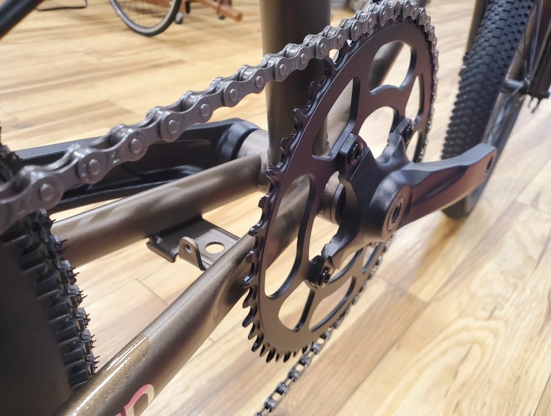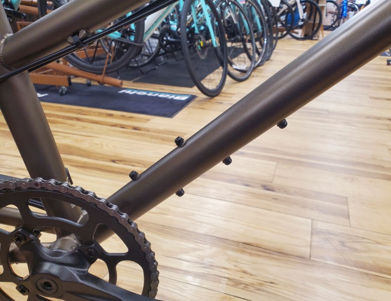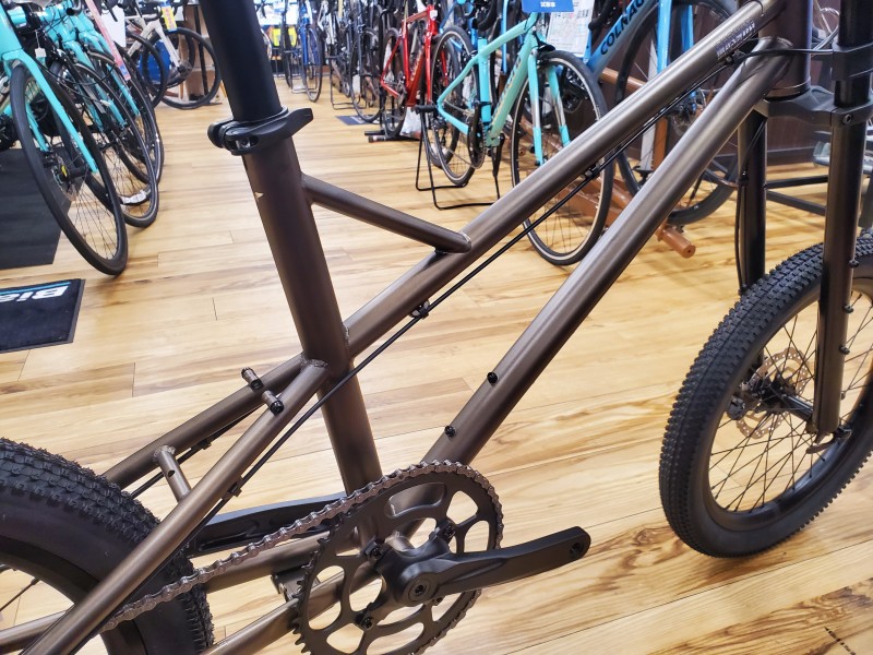 武骨なクロモリフレーム、シートチューブ付近の小さな三角部分は車体を持ち上げる際に便利