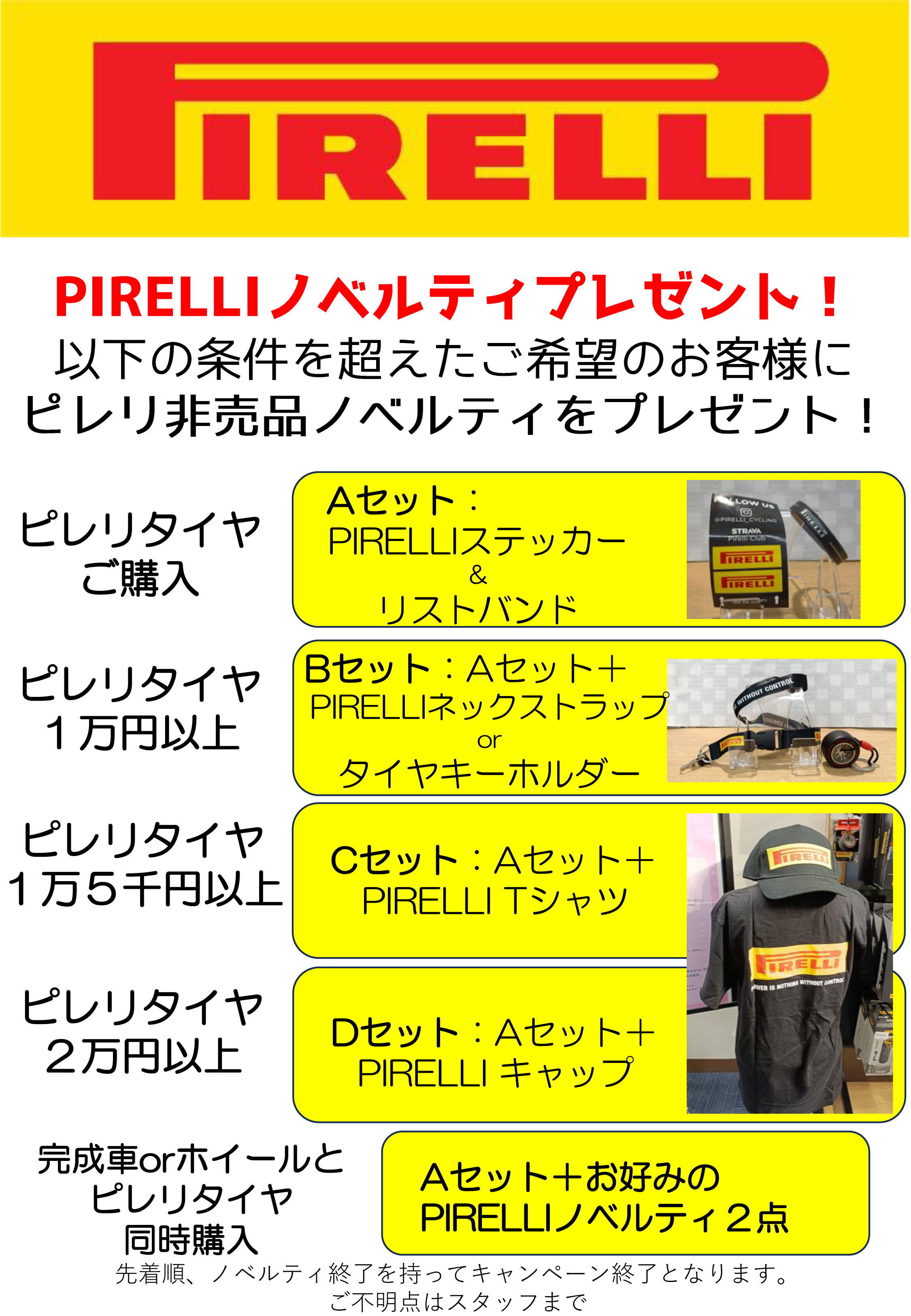 ピレリタイヤご購入のお客様には条件に応じてご希望のノベルティをプレゼント!