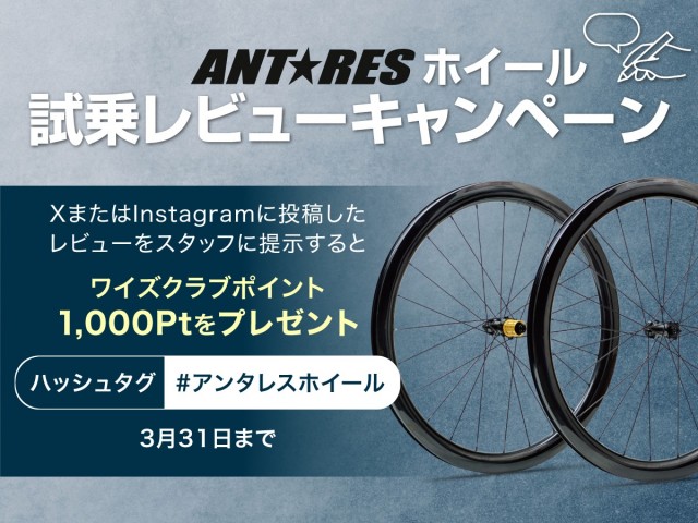ワイズロードオリジナルブランド「ANT☆RES」より「初めてのカスタムホイールに求められる性能を満たすと同時に、見た目にも美しく所有欲も満たすホイール」を目指し開発された、カーボンホイールANT☆RES ROAD CARBON WHEEL 4521 DISC TLR F/R HGが発売されました。先日開催された「スポーツバイクデモ2025 in 東京」でも展示され、非常に注目を集めたホイールの試乗会開催決定しました!!!